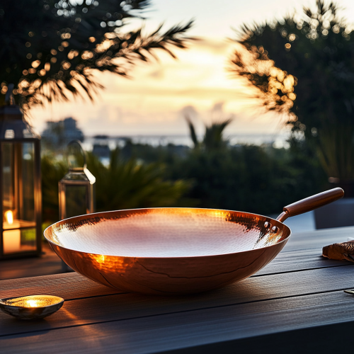 Eine Kupferpfanne mit einen Matten effekt. Pfanne auf der Terasse draußen mit viel Abendlicht und herbst gefühle. Hauptfokus auf die Pfanne. Aufgenommen mit einer Sony Alpha 7R V aus 2 Metern Entfernung