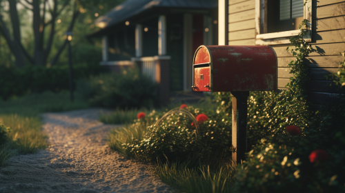 A close-up of a skeleton in human clothes standing in front of a house, looking down the road with empty eye sockets, awaiting a package. Suburban neighborhood with well-kept gardens, empty street. Light contrasts highlight the weathered clothes and skeletal hands gripping an empty package slip, sunlight breaking through clouds, creating a melancholic mood --ar 3:2 --v 6.0 --s 750