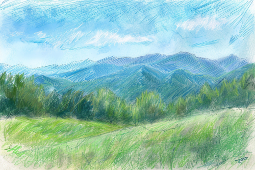 A natural-looking pencil sketch of a mountain landscape, with visible but subtle pencil lines defining the mountain ridges and trees, realistic vibrant green and blue colors in the grass and sky, creating a harmonious blend of nature and artistic detail. Created Using: soft yet defined pencil strokes, realistic green and blue hues, natural shading, fine linework, detailed landscape, subtle color accents, hand-drawn texture --ar 3:2 --v 6.0