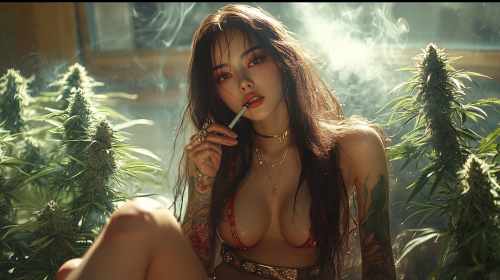 rolling cigarette with big bud cannabis plants in red hot summer very low sitting look asian model hyper realistic sweat skin and boots belt evil eyes super realistic evil look --ar 16:9 --s 750