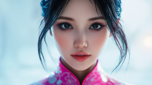 portrait of asia classical beauty woman with very good skin tone, facial symmetry,in the style of 8k resolution,she wears vivid pink gaming jacket and dress, uhd image, fluid gestures, salon kei, light amber and white --ar 16:9 --v 6.1