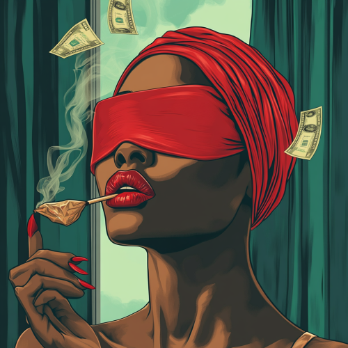 woman smoking real joint with lot of smoke out of mouth very hot yellow wall with big bud cannabis plants in red hot summer very long legs latex pants sitting look thai model hyper realistic sweat skin and latex boots belt evil eyes super realistic evil look --ar 16:9 --s 750
