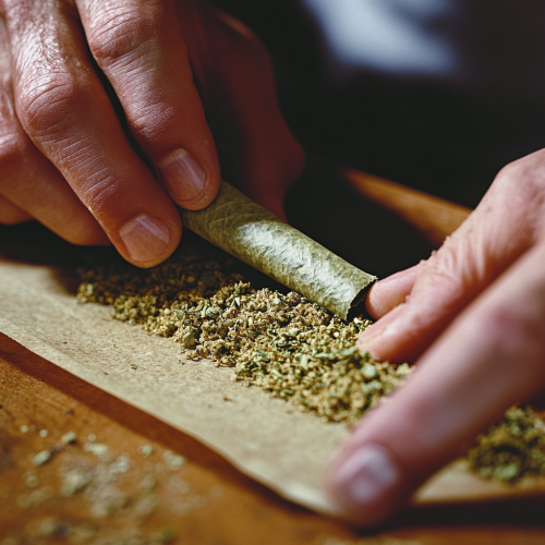 skillfully rolling a cannabis joint. Finely ground cannabis is evenly spread across a rolling paper. The thumbs and index fingers carefully shape and roll the paper into a perfect cylindrical joint, with a filter tip at one end. The joint is sealed by gently licking the adhesive strip and finalizing the roll. Focus on the hands, paper, and cannabis with realistic detail, showcasing the proper rolling technique