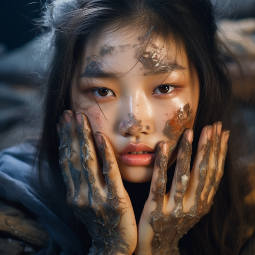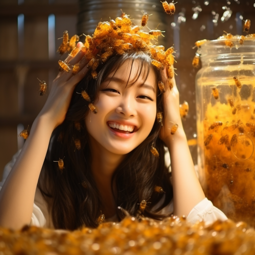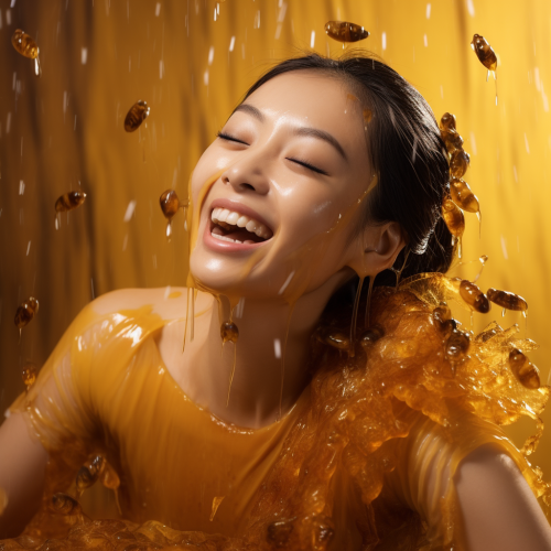 Asian Japan make up girl , skin care, happy, many a jua of honey on face,touch the face and she feels sweet ,realistic photography, in the bathroom pick background, the skin is very hydrated,honey sugar,natural skin ,crazy