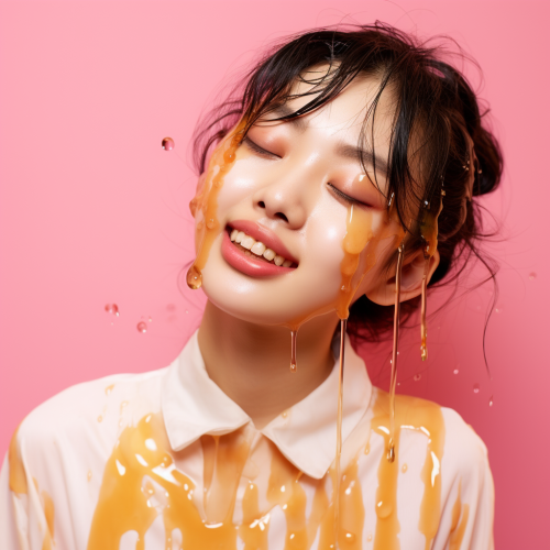 Asian Japan make up girl , skin care, happy, a jua of honey on face,touch the face and she feels sweet ,realistic photography, in the bathroom pink background, the skin is very hydrated,honey sugar,natural skin ,crazy