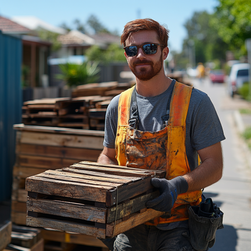 a redheaded 40-year-old man wearing high viz and sunglasses is carrying Wood towards a skip bin in a suburban Brisbane home. He’s removing a decking made from Mabu wood. It’s a bright sunny day in Brisbane and the photo is shot in 4K on a five mark two it is distinguishable that it is not a real photo. It looks so much like a real photo. --s 750