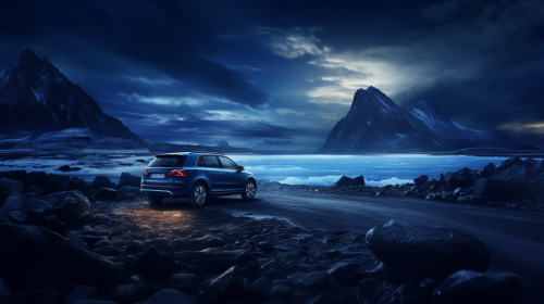 blueSkoda Scala on the road.Iceland scenery with volcano on left side and black beach on right, aurora lights, --ar 16:9