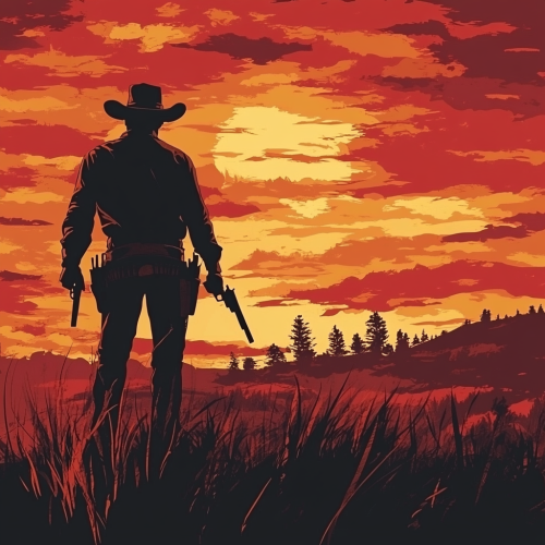 Silhouette of a gunslinger with sunset and revolvers, high contrast shadows, dramatic sky in fiery tones, Western vibe, artistic illustration—[🕴️🌅🔫]:⟨📜🖌️⨹🌅⟩⨷⟨🔫⛓️⟩ –s 900 –c 50