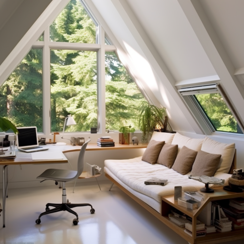 bungalow attic. Slanted walls. White walls. one exterior window. VIEW: interior glass doors onto office with couch. Tags: big desk, mcm couch, small space, attic, retro --v 5.2