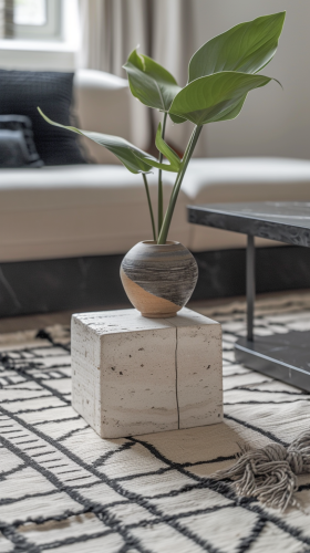 Simple storyboard sketch, gestural lines, black and white, a straight-on view of a modern home wall with many paintings on it that have bold geometric abstractions and stripes, minimal, white space