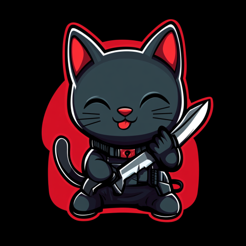 futuristic minimalistic mercenary company logo of a cute kitten with a mischevious expression holding a combat knife winking and giving the peace sign