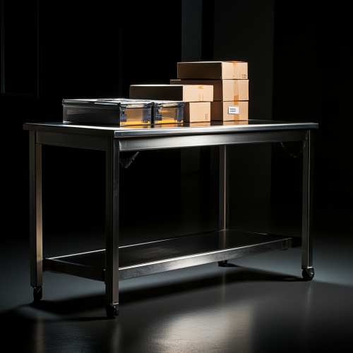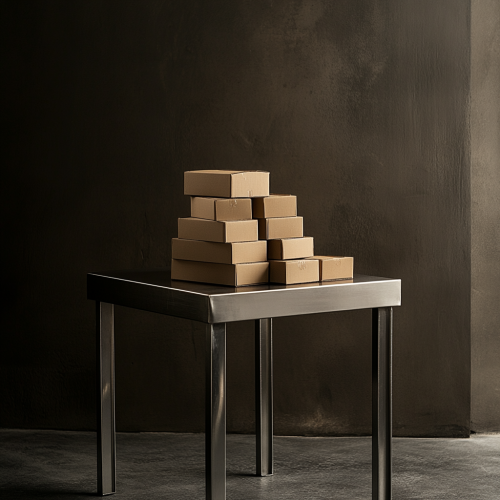 a stainless steel table with a small and tall stack of brown boxes on it, product photography style, with a moody look and subtly dark background, and lighting coming from the front and right sides