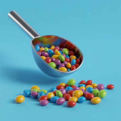 A simple illustration of a stainless steel scoop is scooping many candies, simple background, kawaii, Pixar, blender, c4d --style raw --stylize 180 --v 6.1