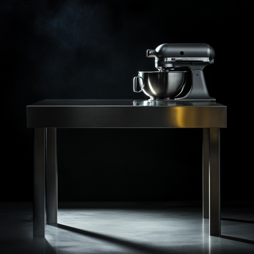 a stainless steel table with a stand mixer on top of it, product photography style, with cool lighting coming from the front and right, and a darkish background. Sort of zoomed in, the entire table should not be visible