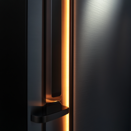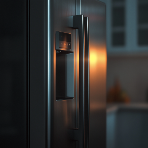 Capture a hyper-realistic close-up of a dimly lit high-end refrigerator, focusing on the elegant brushed steel finish and the subtle glow from the interior through a slightly open door.