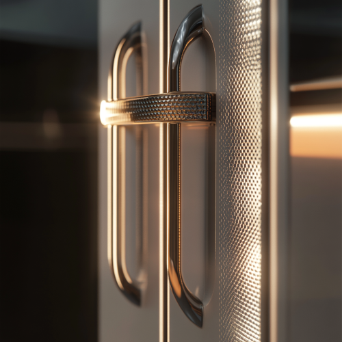 a photorealistic image of a close up of a brushed stainless steel fridge door with a gold ribbon across it
