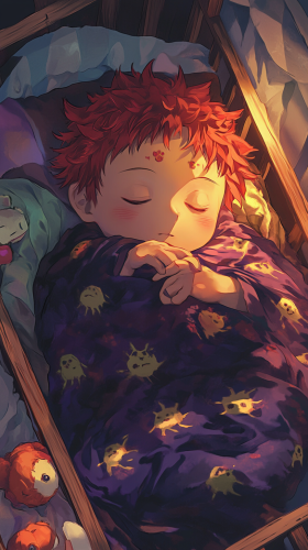 Baby Sukuna from Jujutsu Kaisen in an ultra-cute 'uwu' style, peacefully sleeping in a small wooden crib, wrapped in a soft dark purple blanket with tiny cursed energy symbols. His chubby cheeks are blushing, and a gentle glow of cursed energy surrounds him like a protective aura. In the crib, he cuddles a plush finger, reminiscent of his curse marks. The crib is surrounded by small plush toys shaped like Jujutsu Kaisen items, with pastel colors creating a warm, cozy atmosphere. 8K, HDR, high quality, --ar 9:16