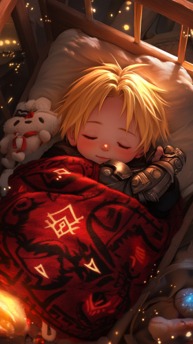 Baby Edward Elric from Fullmetal Alchemist in an ultra-cute 'uwu' style, peacefully sleeping in a small wooden crib, wrapped in a soft red and black blanket with tiny alchemical symbols. His chubby cheeks are blushing, and his distinctive blonde hair and automail arm are depicted adorably. A gentle glow of alchemical energy surrounds him like a protective aura, with his iconic automail arm playfully draped around the crib. In the crib, he cuddles a plush of his alchemic symbols. The crib is surrounded by small plush toys shaped like items from Fullmetal Alchemist, with pastel colors creating a warm, cozy atmosphere. 8K, HDR, high quality, --ar 9:16