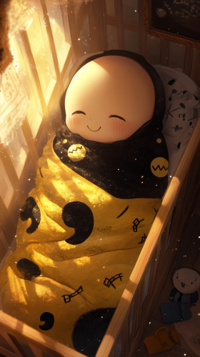 Baby Koro-sensei from Assassination Classroom in an ultra-cute 'uwu' style, peacefully sleeping in a small wooden crib, wrapped in a soft yellow and black blanket with tiny tentacle symbols. His chubby cheeks are blushing, and his round, smiling face adds to his adorable look. A gentle glow of classroom energy surrounds him like a protective aura. In the crib, he cuddles a plush of his signature tentacle. The crib is surrounded by small plush toys shaped like classroom items, with pastel colors creating a warm, cozy atmosphere. 8K, HDR, high quality, --ar 9:16