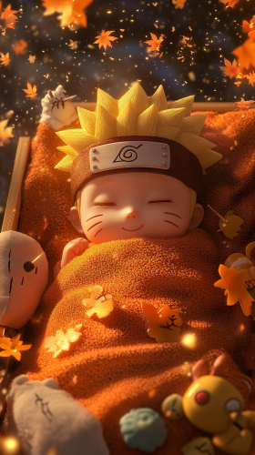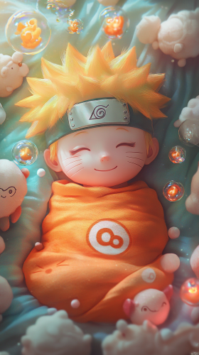 Baby Naruto in an ultra-cute 'uwu' style, peacefully sleeping in a small wooden crib, wrapped in a soft orange blanket with tiny leaf symbols. His chubby cheeks are blushing, and a gentle glow of chakra surrounds him like a protective aura. The crib is surrounded by plush toys shaped like ninja tools, with pastel colors creating a warm, cozy atmosphere. 8K, HDR, high quality, --ar 9:16