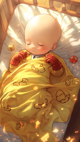 Baby Saitama from One Punch Man in an ultra-cute 'uwu' style, peacefully sleeping in a small wooden crib, wrapped in a soft yellow blanket with tiny superhero symbols. His chubby cheeks are blushing, and his signature bald head adds to his adorable look. A gentle glow of hero energy surrounds him like a protective aura. In the crib, he cuddles a plush of his iconic red gloves. The crib is surrounded by small plush toys shaped like superhero items, with pastel colors creating a warm, cozy atmosphere. 8K, HDR, high quality, --ar 9:16