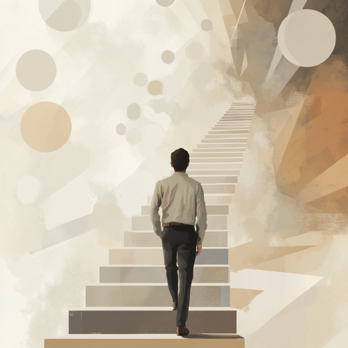 Generate a digital art for A digital art scene showing a professional confidently setting and achieving goals. The background features a series of ascending steps or milestones, each representing a smaller task leading to a larger goal. The color palette should prominently include shades of light gray. --ar 1:1