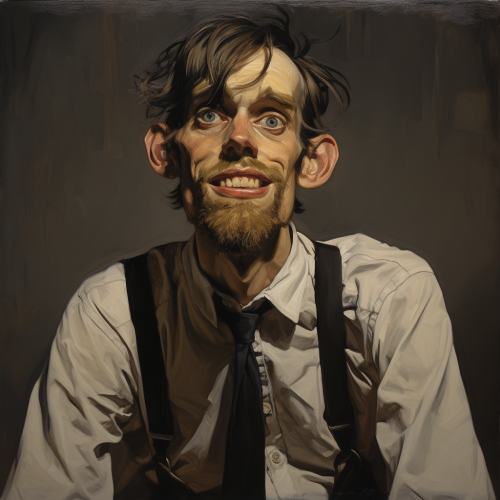 karl morse: pot-belly, thin limbs, receding hairline, brown hair, patchy short beard, bizarre demeanor, crazed smile, dressed neatly,.