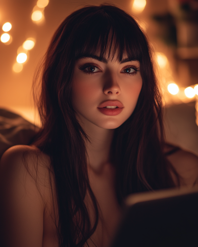 A photo of the beautiful brunette woman with bangs, in her bedroom at night, she is watching to the laptop on her knees. She has long hair and is wearing makeup, with soft lighting. --ar 35:44 --style raw