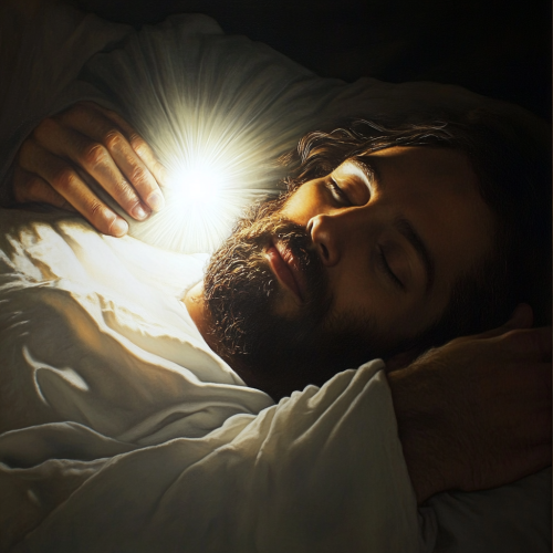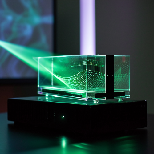 Small cylinder projector in bedroom projects dramatic movie. Person watching.