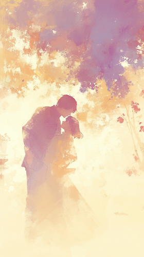 A picture using a watercolor style. Light color. A person watching their partner from afar, feeling a mix of sadness and contentment. Soft, pastel colors represent the bittersweet decision to leave, even though they still care deeply. --ar 9:16 --niji 6