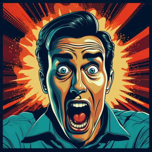 Create a pop art style visual features a funny person watching horror movie, giving scary expression and screaming