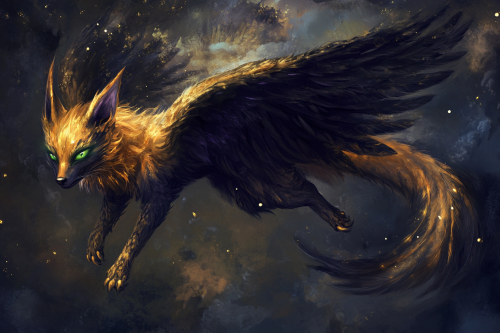 Small fox with dark powers, deep black fur, glowing purple eyes, shadowy aura, starry night background.