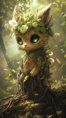 Chibi écureuil avec des pouvoirs de la nature, son pelage est parsemé de feuilles et de fleurs, et ses yeux sont d'un vert profond, comme des émeraudes. Des racines et des lianes semblent émerger du sol et entourer ses pattes, tandis que des pétales et des petits bourgeons flottent autour de lui. Le fond montre une forêt luxuriante, pleine de verdure et de lumière douce. 8K, highly detailed, --ar 9:16