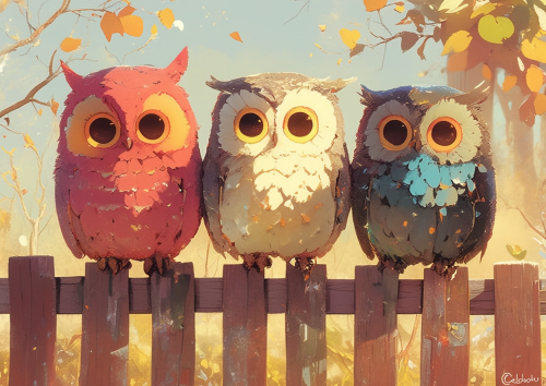 Three unique, whimsical, colorful owls, with big eyes, sitting on the fence, in the style of a guweiz and tim burton, with a bold, bright pastel color palette, a detailed background, and a hyper-realistic style. --ar 128:91 --s 250 --niji 6