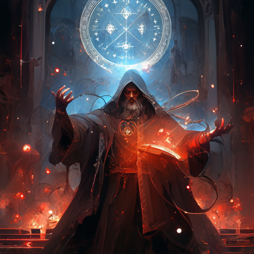 illustration, ink on paper, of a fantasy occult trading card of A pretty teenage girl, she is a wizard apprentice, she is casting a spell with her hands. Its obsidian-like glow reflects its excitement and strength, with a backdrop of an ancient city. The scene conveys the girls's resilience and its connection to the wizards ancient history in the art style of Graham Ingels, Mike Mignola, centered, psychedelic colors, vintage, --ar 3:4 --v 6.0 --s 75
