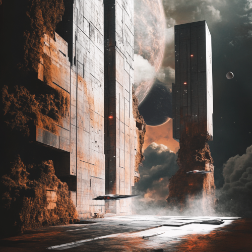 a massive:: industrial brutalism styled:: spaceship with a tiny vehicle passing through to contrasting the scene, dramatic, 4k, photorealistic, volumetric lighting, massive