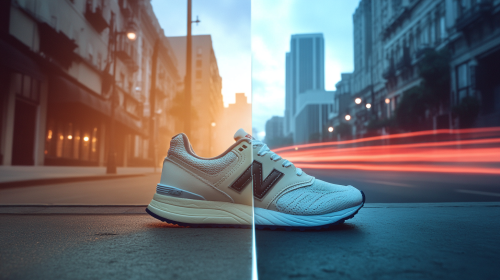 a new balance 740 shoe sitting in the middle of a split screen of a day passing happening in the background left side day and right side night --ar 16:9