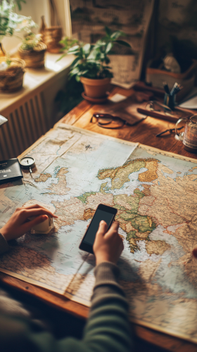 A high-quality photograph of a person sitting at a wooden table with a large map of Europe spread out before them, holding a smartphone in their hand. The table is adorned with various travel-related items like a passport, a compass, a coffee cup, and a pen. Soft daylight filters through a nearby window, casting gentle shadows across the scene. The person is focused on the phone, planning their European adventure. The background includes a subtle hint of a cozy, modern room. Created Using: Canon EOS 5D, natural lighting, shallow depth of field, travel photography, contemporary style, high contrast, warm tones --ar 9:16 --v 6.1