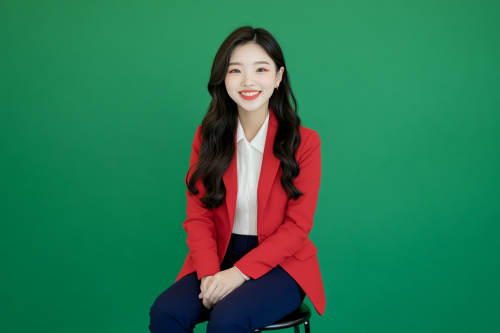 A young Japanese woman in her early twenties with a charming smile, dressed in a navy blue blazer, red skirt, and a white blouse, sitting on an iron stool with her feet clearly visible. The green screen background enhances the subject. Canon EOS R5 settings, full-body frontal perspective, hd quality, natural lighting --ar 128:85 --v 6.1