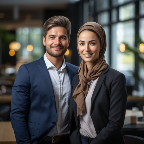 blonde middle-aged woman and dark-haired middle aged man with glasses stood in busy street in UK with arms crossed. Photo realistic