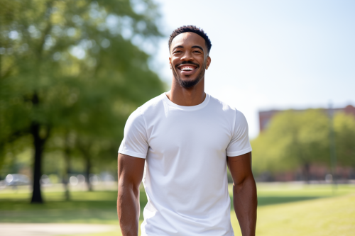 a photography for a product page of a handsome black man smiling dressed with white jersey, city park in the background --ar 3:2