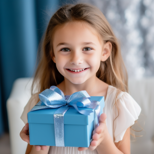 a bright and light image of a very happy 7 year old girl with a nice giftbox in her hands --style raw