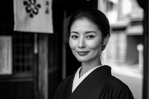 Photographed A beautiful Japanese woman in her 30s, the landlady, is wearing a plain kimono and is standing in front of a Japanese-style building with a noren curtain, smiling slightly, shot by DSLR –s 750 --ar 3:2