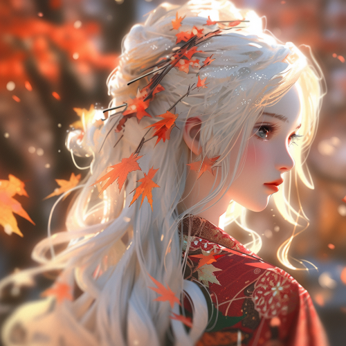A cute girl featuring long white hair , A girl with a translucent, ethereal presence , wearing a traditional Japanese kimono, looking at me, with maple leaves scattering around, sparkling, super realistic 3D animation style. the girl’s art project coming together in a detailed and colorful manner. colorful refraction , 3d super realistic, ar 9:16 --niji 5