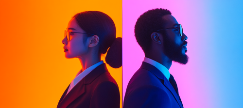An abstract, vibrant banner image featuring two individuals from different cultural backgrounds (a japanese woman and an african man) standing on opposite sides in the style of James Turrell --ar 9:4