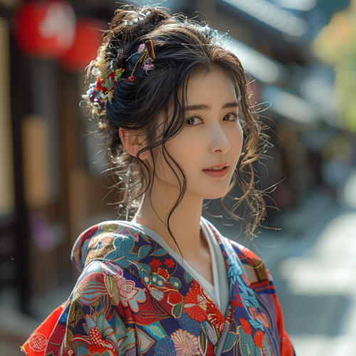 She is a 30-year-old Japanese woman who is walking around Kyoto in a kimono. We can see her whole body. She has long black hair up. Makeup is simple. It is 16K quality with photo quality. --s 750 --v 6.0