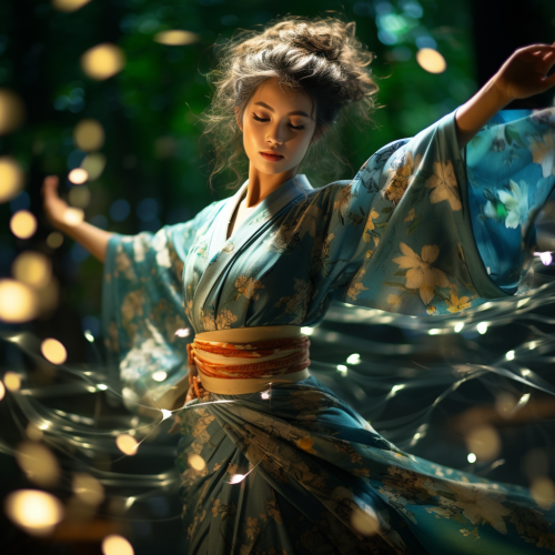 A beautiful Japanese woman in kimono dancing beautifully ,Japanese bamboo forests and glowing fireflies at night,best quality, realistic,hyper detailed, beautiful, woman, landscape photo, wide shot, full body shot, dutch angle shot, wide shot, circle composition, vibrant academia, theatre academia, ultra realistic photo, motion blur, sunlight, wide-angle lens, slow shutter speed, dramatic contrast --s 250 --v 5.2