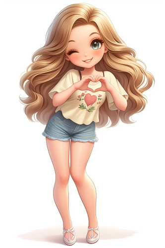 A cute girl very fashion kawaii chibi hand making heart symbol, smile brightly, full body, in the style of kawaii chibi style, jean hiphop, t shirt, elegant shoes, beautiful big face, sweet and smiling features posing and fashion show style thomas kinkade Nadja Baxter Anne Stokes nancy noel, against a white background, clear background separation, digital art in the style of Anna Dittmann, using digital art techniques such as marker illustrations, ink washes, and hand-drawn elements, adorable digital illustration, highly detailed, 2d, kawaii, flat --ar 2:3 --niji 6