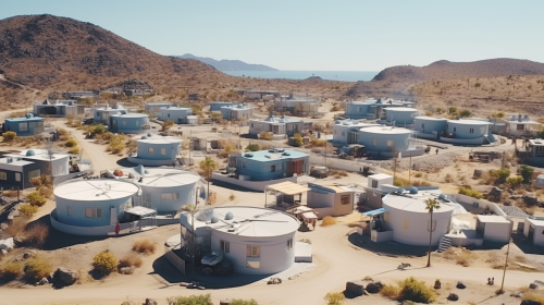 Smiling settlers watch child interact with construction robot in futuristic settlement.
