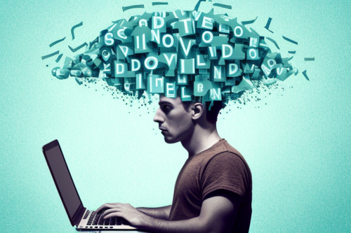 a man typing a blog on a laptop with letters floating around his head --ar 3:2 --v 4